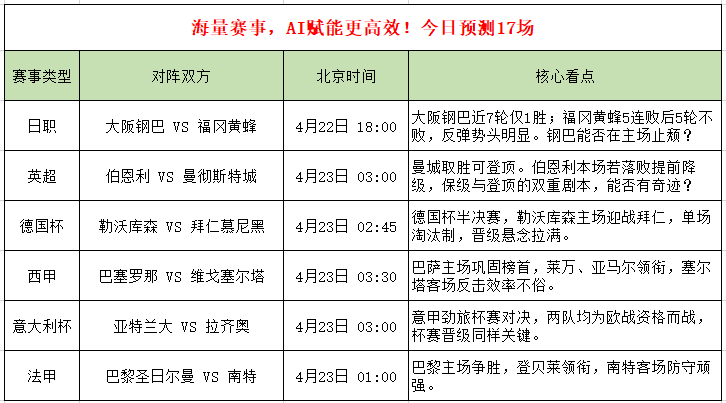 17场赛事全覆盖,早场日韩联赛率先开打,深夜豪门对决压轴登场。经过昨日的校准进化,今日AI预测值得重点关注。立即跟上AI的脚步,用数据解锁胜负密码,把握今日良机!点击查看